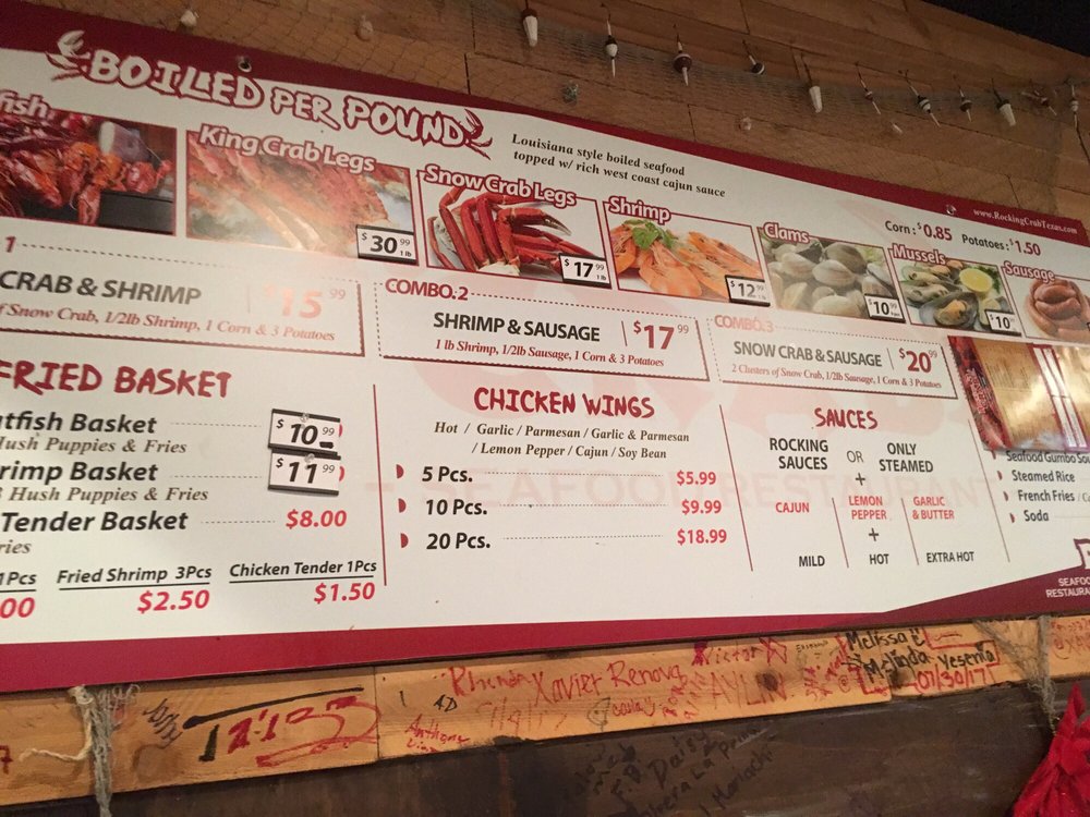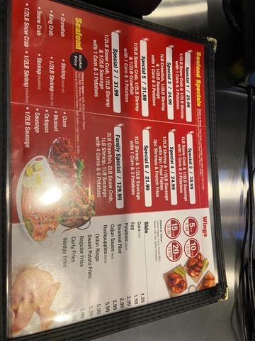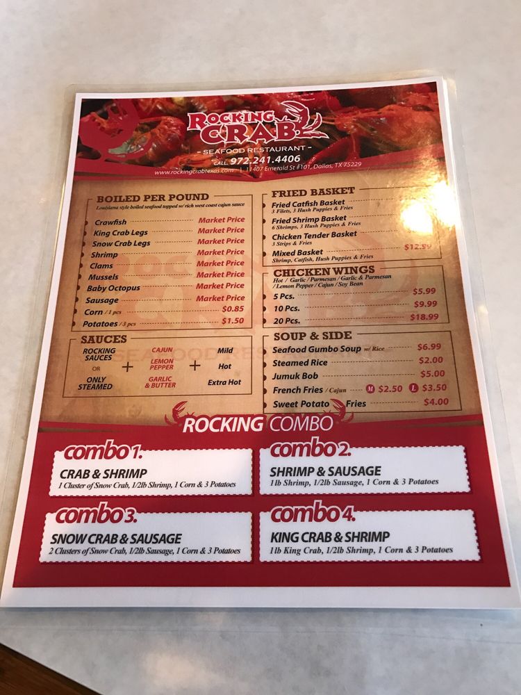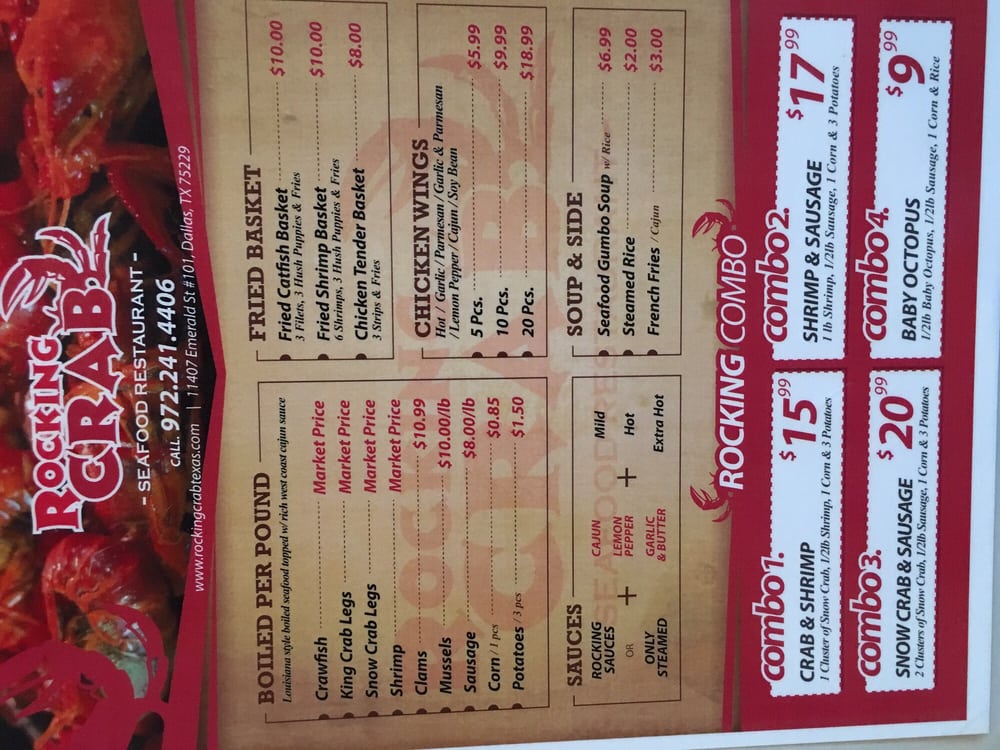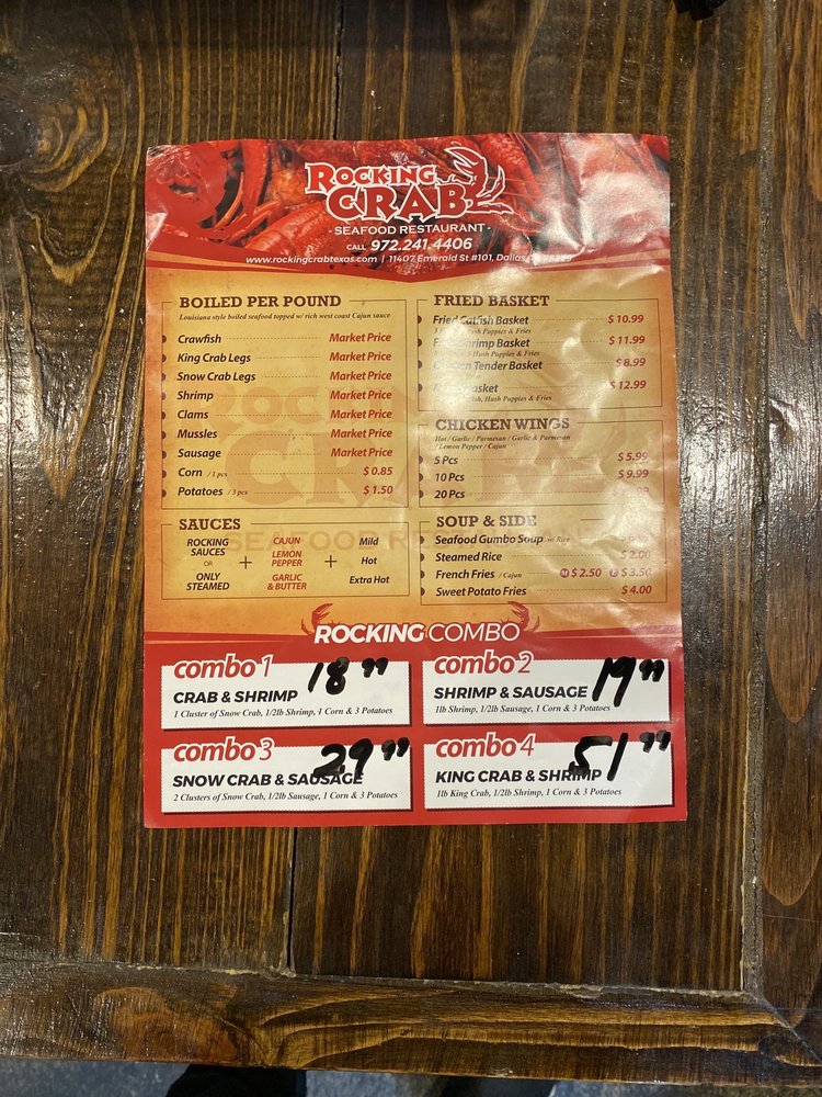 Introducing the menu at Rocking Crab, a Cajun/Creole seafood restaurant in Dallas, TX. Known for their delicious boiled seafood per pound, including corn and clams. Customers rave about the simple online ordering process and prompt service. The menu features mouth-watering options like chicken wings and a variety of beverages. While some customers have had mixed experiences with the service, others praise the flavorful dishes, such as Cajun-style medium spicy crawfish and crab legs. With a casual atmosphere, wheelchair accessibility, and options for takeout and delivery, Rocking Crab is a great choice for groups and families looking for a seafood feast. Experience the bold flavors and satisfying portions at Rocking Crab today.